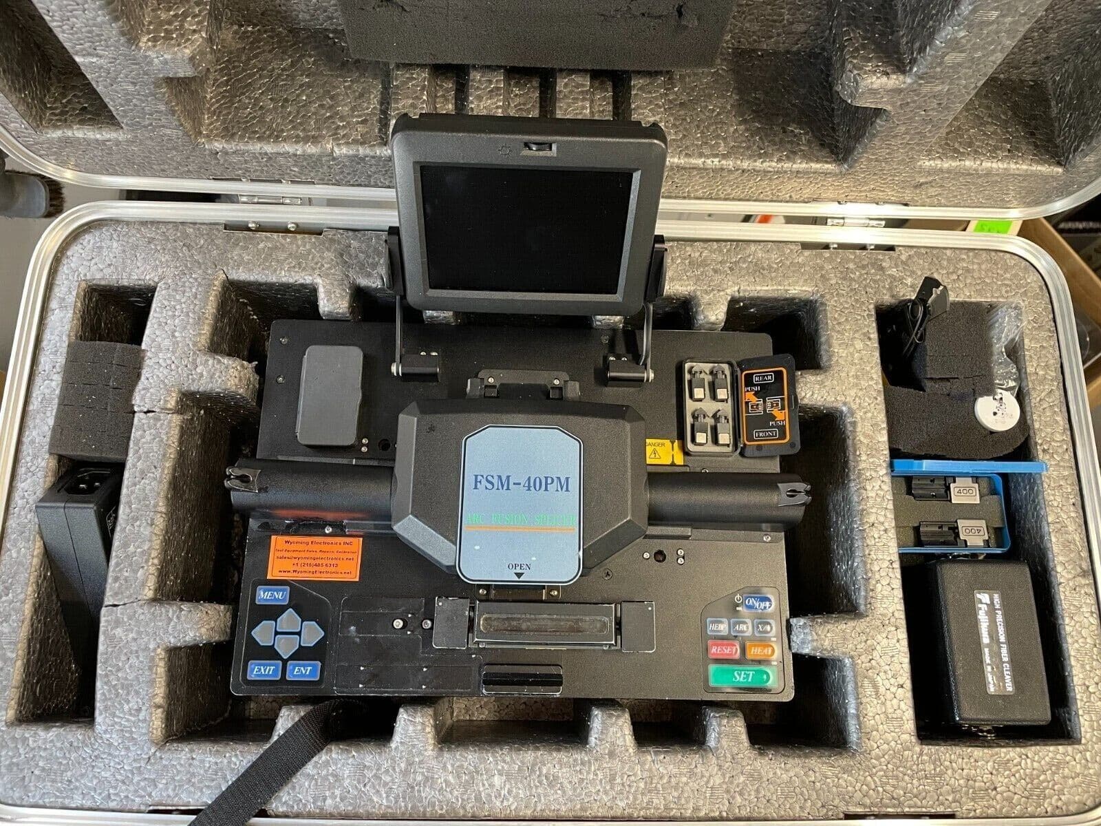 100% Functional ready for use! Comes with FSM-40PM carrying case, 250 and 400um fiber holders (Left and Right) fiber clam , power supply, fiber stripper, oven sleeves, and Fujikura optical cleaver and caring case.